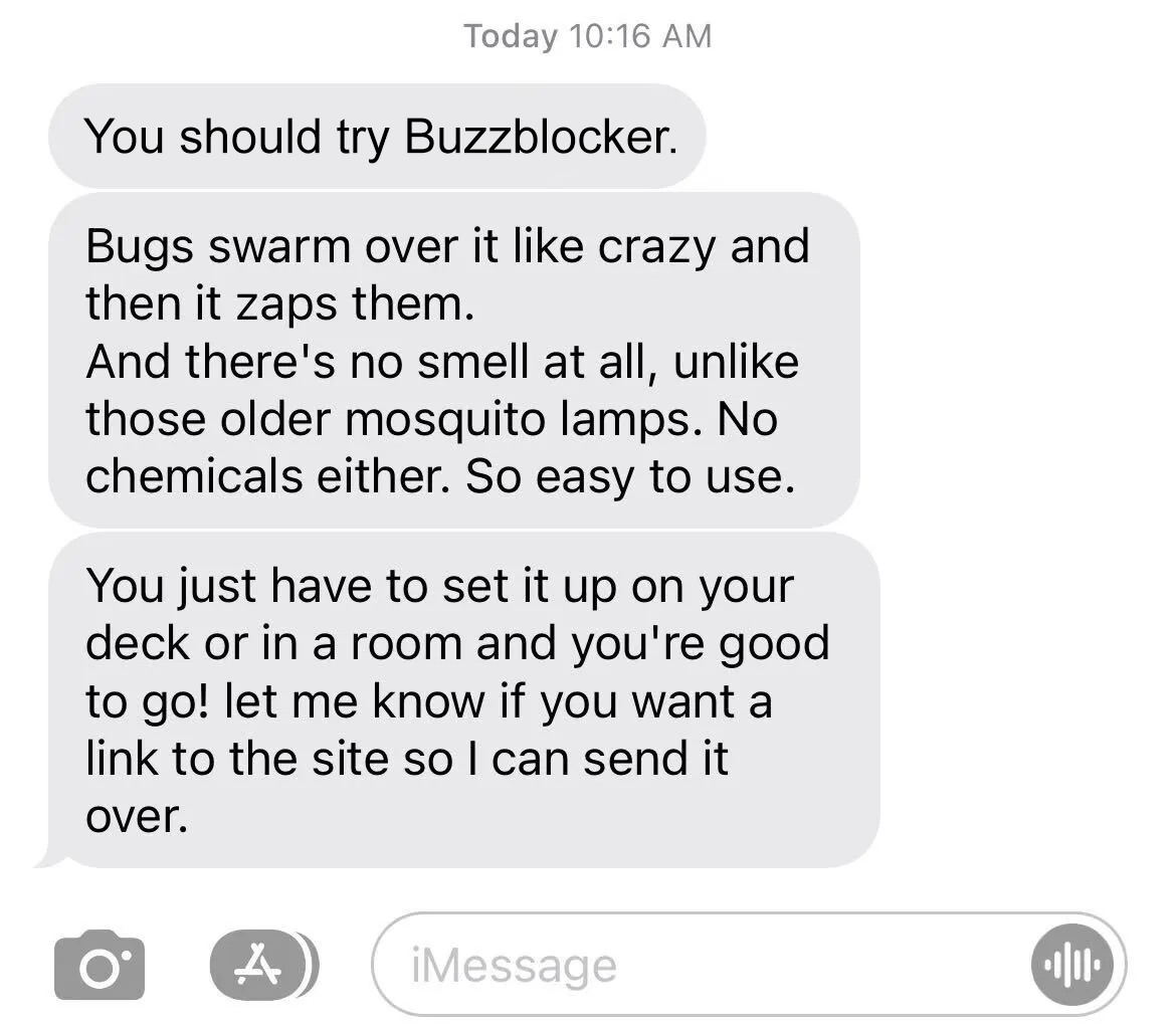 "We often eat outside in the garden, but sometimes in summer its impossible due to mosquitos. We bought BuzzBlocker and its been live changing. It's suppose to attract and kill mosquitoes, but they don't even come anymore. Maybe they know they will die ahah."